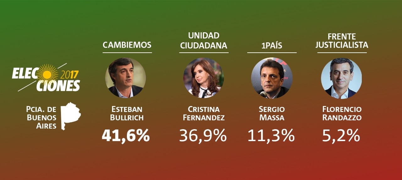 Con el 95,76% de las mesas escrutadas, los datos oficiales de la Dirección Nacional Electoral dan en la provincia de Buenos Aires un resultado a favor de Cambiemos en la categoría a senadores, por sobre Unidad Ciudadana, de Cristina Kirchner, por una diferencia de más casi 10 puntos, mientras que 1País, de Sergio Massa, cosecha algo más de 10% y el Frente Justicialista un 5%.