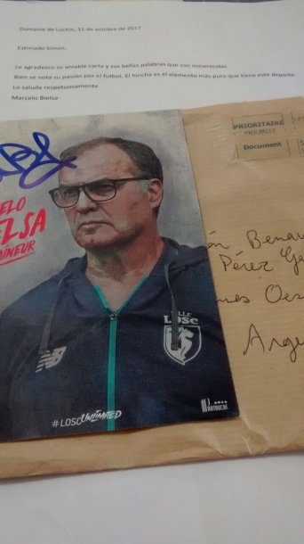 Sucede que un día, el correo golpeó la puerta de su casa y en el sobre había una hoja que decía: "Le agradezco su amable carta y sus bellas palabras que son inmerecidas. Bien se nota su pasión por el fútbol. El hincha es el elemento más puro que tiene este deporte. Lo saluda respetuosamente. Marcelo Bielsa", con una foto del entrenador autografiada.