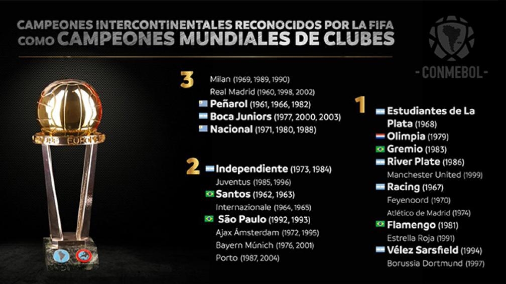 Este viernes, la Federación Internacional del Fútbol Asociado reconoció a 13 clubes sudamericanos que ganaron la Copa Intercontinental como campeones del Mundial de Clubes. Entre ellos están: Boca, River, Independiente, Racing, Vélez y Estudiantes.