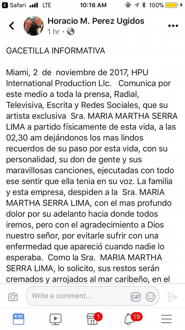 La familia de María Martha Serra Lima entregó un comunicado a la productora con la que la cantante trabajaba desde el 2000 informando el fallecimiento de la artista.