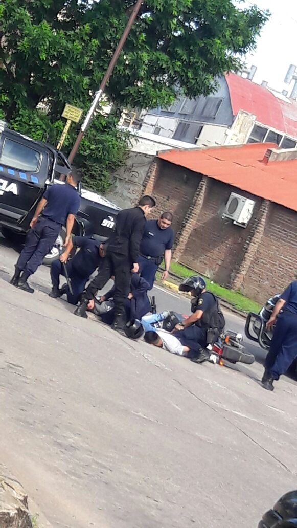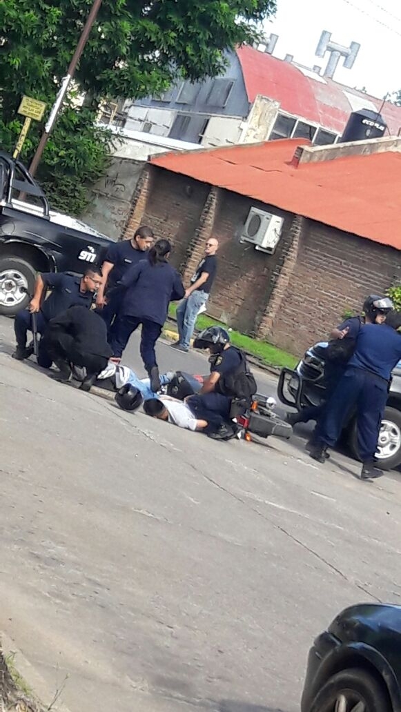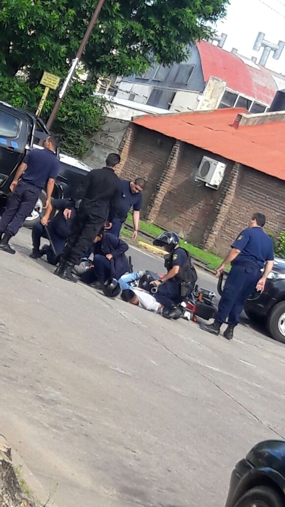 Cuando los hombres a bordo de la moto observaron la presencia policial, se dieron a la fuga rápidamente, por lo que los uniformados iniciaron una persecución que culminó en calles 25 de Mayo y Pasaje Larramendi, cuando los sospechosos perdieron el control de la moto y cayeron al asfalto.