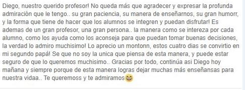 "Diego, nuestro querido profesor! No queda más que agradecer y expresar la profunda admiración que le tengo.. su gran paciencia, su manera de enseñarnos, su gran humor, y la forma que tiene de hacer que los alumnos se integren y puedan disfrutar! Es además de un gran profesor, una gran persona.. la manera como se interesa por cada alumno, como los ayuda como los aconseja para que puedan tomar buenas decisiones, la verdad lo admiro muchísimo! Lo aprecio un montón, estos cuatro días se convirtio en mi segundo papá! Sé que no soy la única que piensa de esta manera, y puede estar seguro de que lo queremos muchísimo.. Gracias por todo, continue así Diego hoy mañana y siempre porque de esta manera lográs dejar muchas más enseñanzas para nuestra vidaa.. Te queremoss y te admiramos".