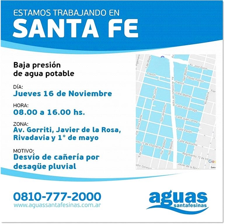 Aguas Santafesinas informa a los usuarios de un sector de los barrios Facundo Quiroga y Guadalupe Oeste que el jueves 16 entre las 08:00 y las 16:00 disminuirá la presión del suministro de agua potable.