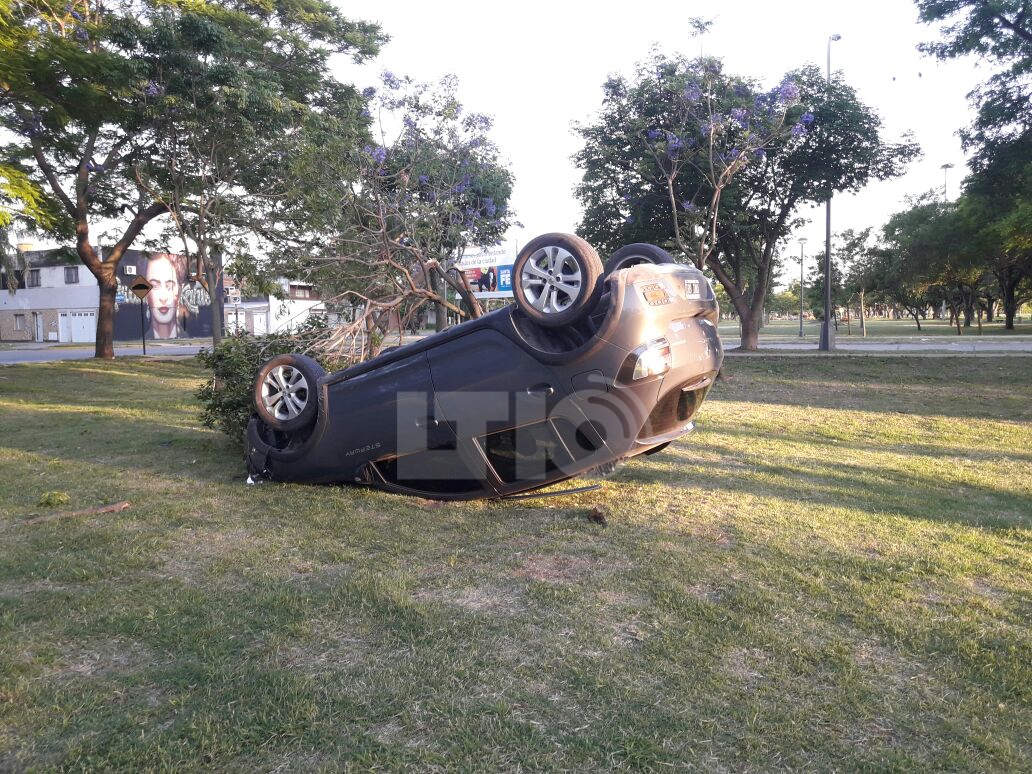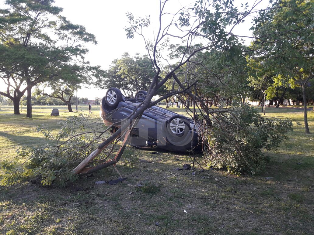 Por la gran velocidad a la que venía, el impacto provocó el vuelco del vehículo que quedó con sus cuatro ruedas hacia arriba sobre el césped del Parque Federal.