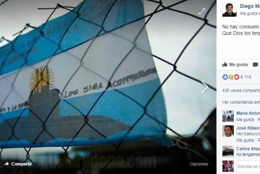 La tremenda tristeza nacional también involucró a Diego Maradona, quien se solidarizó en su Facebook.  "No hay consuelo...Que Dios los tenga en la gloria, muchachos", escribió el Diez en su Facebook.