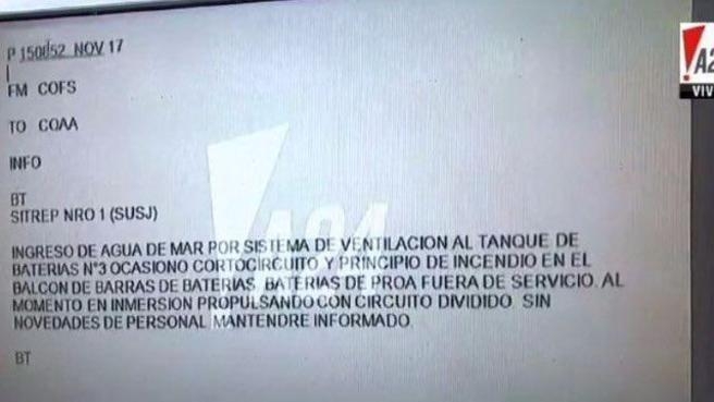 "Ingreso de agua de mar por sistema de ventilación al tanque de baterías N°3 ocasionó cortocircuito y principio de incendio en el balcón de barras de baterías. Baterías de proa fuera de servicio. Al momento de inmersión propulsando con circuito dividido. Sin novedades de personal mantendré informado", dice la comunicación, según lo reveló este lunes por la noche el canal A24.