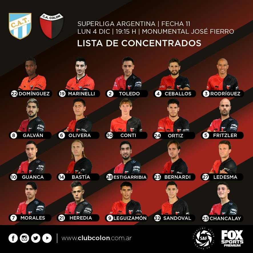 Colón oficializó a través de sus redes sociales la lista de jugadores que concentran para viajar rumbo a Tucumán, donde este lunes el equipo de Eduardo Domínguez visitará a Atlético, en el marco de la fecha 11 de la Superliga.