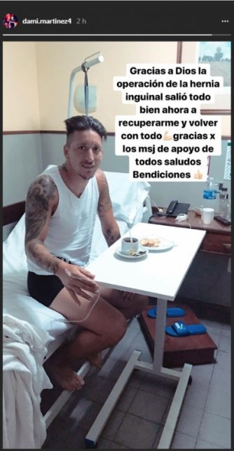 El lateral Damián Martínez fue operado de una hernia inguinal, según lo contó en su cuenta de Instagram, donde se lo puede obervar desayunando en un cuarto de hospital. Dicha imagen fue acompañada por un texto donde cuenta lo que le pasó y que la intervención fue exitosa.