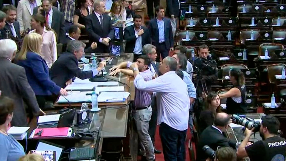 Cuando Monzó anunció el qoúrum, se registraron fuertes incidentes en el recinto, cuando varios parlamentarios fueron a recriminarle para que levante la sesión. Hubo empujones y gritos que tuvieron de protagonistas al presidente de la Cámara y los diputado Máximo Kirchner, Guillermo Carmona y Leopoldo Moreau.