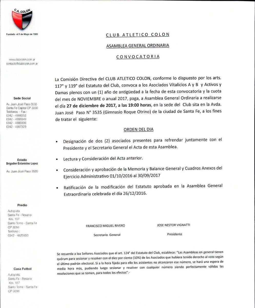 Mediante un comunicado, Colón informó a sus socios que la Asamblea General Ordinaria se llevará a cabo el miércoles 27 de diciembre de 2017, a las 19:00 hs, en la sede del Club JJ Paso 3535. El Gimnasio Roque Otrino albergará a los socios sabaleros que quieran concurrir y que deberán tener la cuota de noviembre abonada como requisito principal o el abono anual 2017.