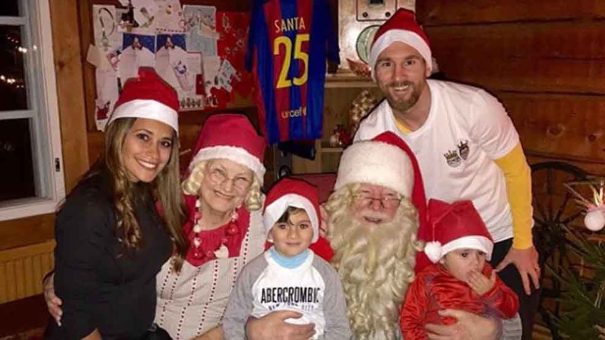 En la imagen, está Messi, Antonella y los dos hijos de la pareja en los brazos de una mujer y un hombre disfrazados con la indumentaria de Papá Noel.