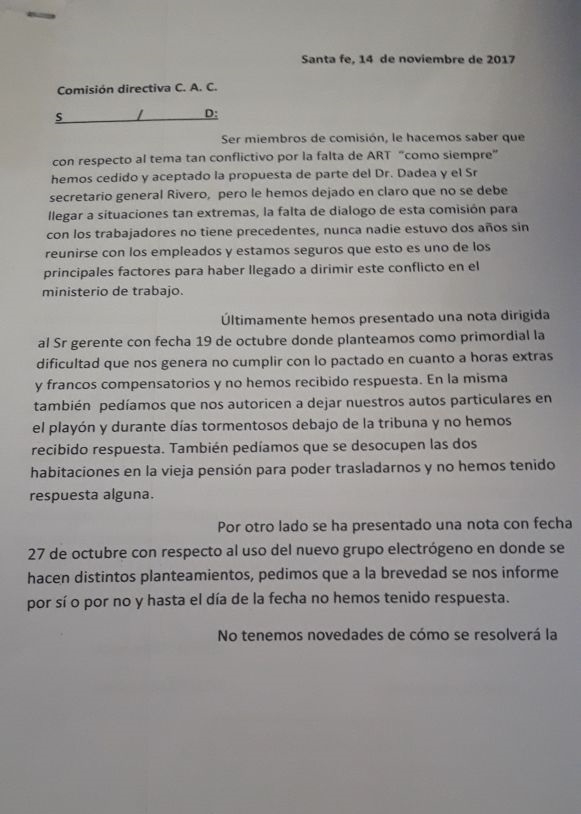 Existen charlas con los dirigentes de las instituciones, pero hasta el momento no hubo novedades y por eso existe un paro de actividades. Además, se pide por el acondicionamiento de la ART, fundamental para el cuidado del personal y que también presenta inconvenientes. Hoy están sin cobertura.