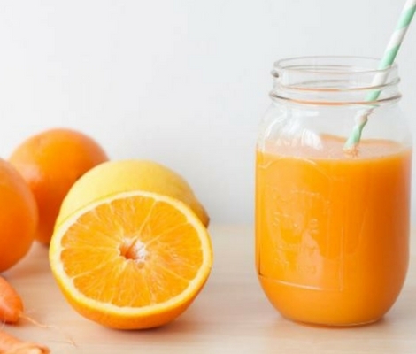 Extrae el zumo de las zanahorias y procésalo en la licuadora con el zumo de una naranja y la espinaca.