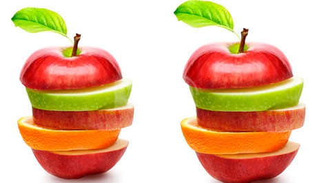 Veamos, si asignamos un valor a las manzanas, otro a las bananas y otro a los cocos, las primeras tres líneas serían tres ecuaciones y tres incógnitas, si conseguimos resolver el sistema que forman esas tres líneas, la última será una simple suma ¿no? a ver: