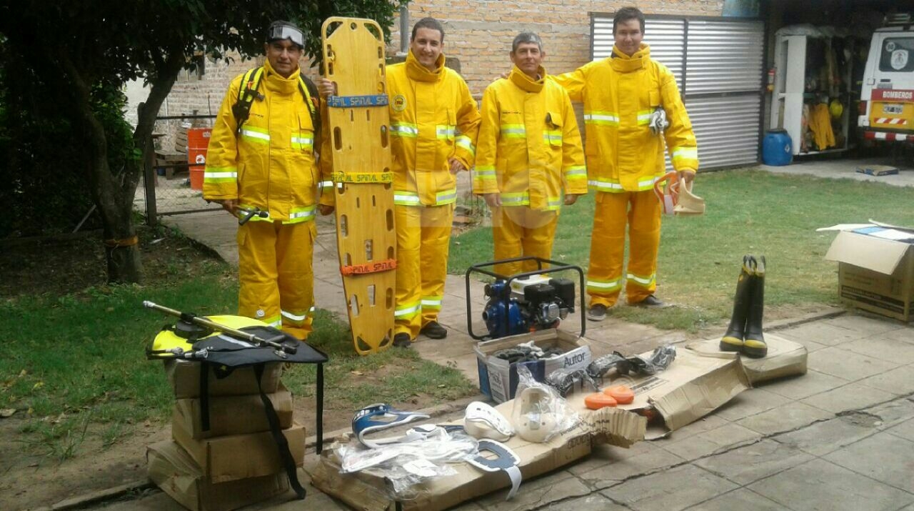 Laurenti es distribuidor de equipamiento para incendios y no escatimó en su ayuda: les regaló una motobomba de alta presión, dos tablas espinales, dos mochilas forestales, cuatro  chaquetones y pantalones forestales, cinco pares de botas de incendio, antiparras, guantes y collares cervicales.