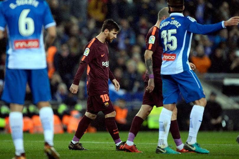 El Barcelona sumó hoy su primera derrota desde el 16 de agosto al perder 1-0 ante el Espanyol en la ida de los cuartos de final de la Copa del Rey en un partido marcado por el penal errado por Lionel Messi en la segunda parte.