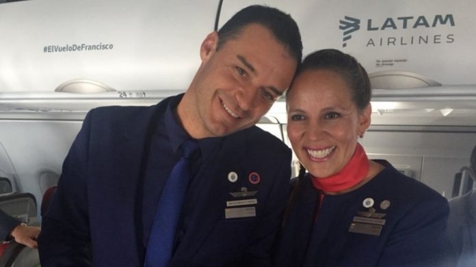 Francisco sorprendió a una pareja que trabajaba en el vuelo que tomó para dirigirse a Iquique, última escala en su viaje por Chile.