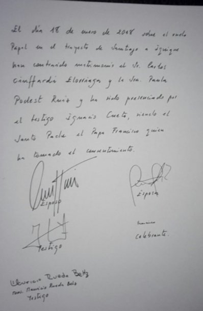 "El día 18 de enero de 2018, sobre el vuelo papal en el trayecto de Santiago a Iquique han contraído matrimonio el señor Carlos Ciuffardi Elorriaga y la señora Paula Podest Ruiz y ha sido presenciado por el testigo Ignacio Cueto, siendo el santo padre, el papa Franciso, quien ha tomado el consentimiento", indica el acta escrita a mano que certifica el matrimonio.
