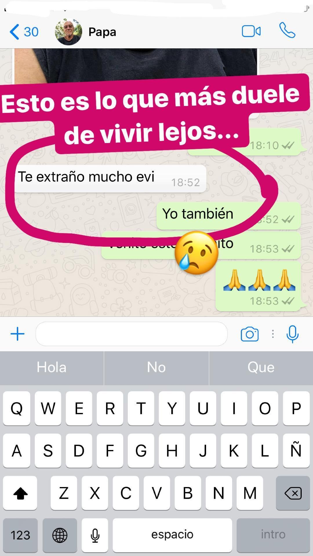 Las familias "botineras" padecen la distancia, aunque por fuera parezca que sus vidas son puro brillo y glamour. Y así lo hizo saber Evangelina, en un posteo en Instagram que invitó a la reflexión. Mostró un mensaje de su papá en el que le dice que la extraña mucho y escribió: "Esto es lo que más duele de vivir lejos".