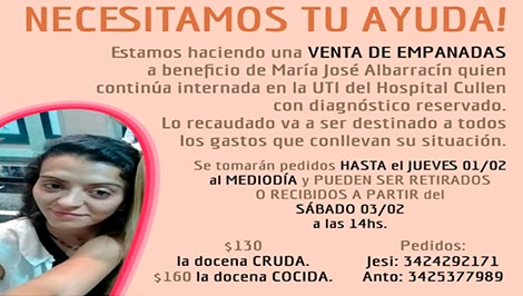 Para ayudarla a afrontar los gastos que le genera el permanecer internada, y el alquiler del departamento en el que vivía, un grupo de amigos inició una campaña solidaria. Consiste en una gran venta de empanadas, cuya recaudación aliviará la dificil situación en la que se encuentra la joven.