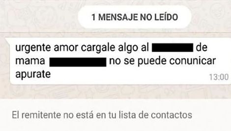 "Urgente, amor". Así arranca un mensaje que comenzó a viralizarse por WhatsApp, donde se le pide a quien lo reciba que cargue crédito a un determinado número porque "mamá no se puede comunicar". Y se concluye con un contundente: "apurate".
