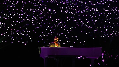 Mientras Timberlake disminuía el ritmo de una coqueta versión del éxito de Prince "I'd Die 4 U", imágenes de la era de Purple Rain eran proyectadas en el techo del nuevo estadio US Bank en medio de una neblina humeante, cerrando con la silueta de "The Purple One" (Aquel de Púrpura), como le decían a la difunta estrella, portando su guitarra.