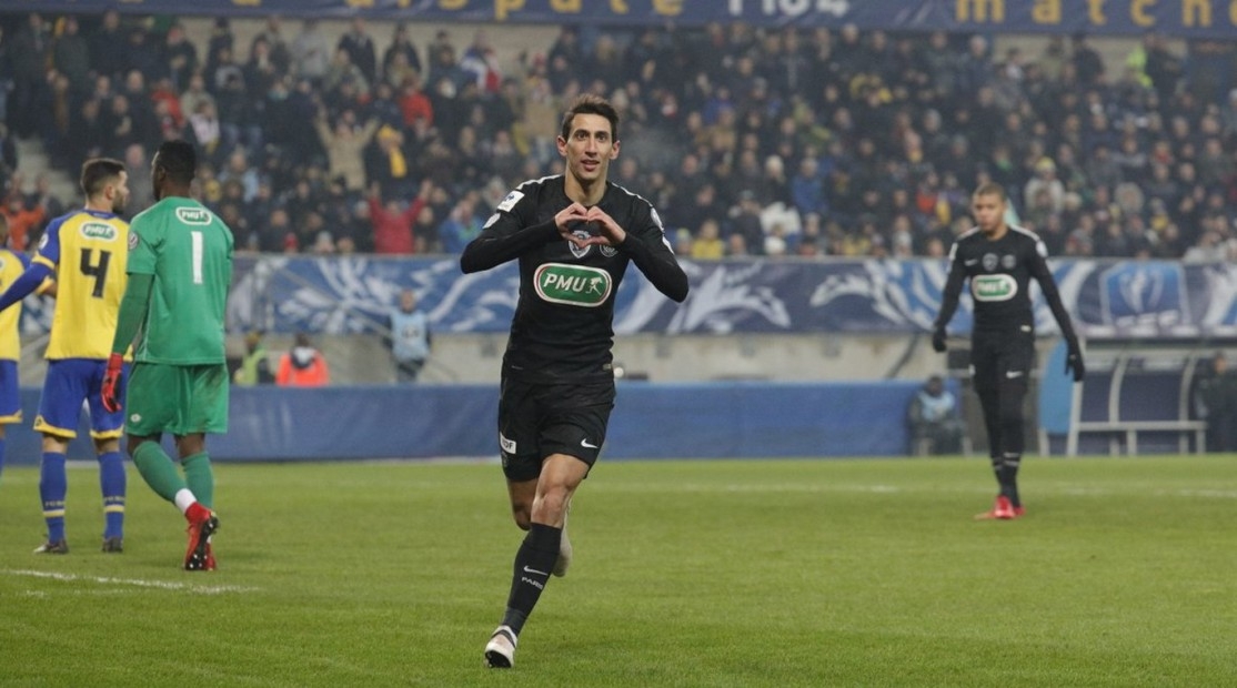 Ángel Di María marcó hoy tres goles y fue la gran figura en la clasificación de París Saint Germain a los cuartos de final de la Copa de Francia con el éxito como visitante Sochaux por 4 a 1.