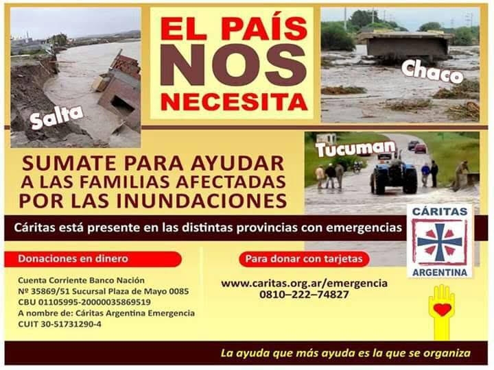 Las inundaciones están afectando a numerosas familias de diferentes provincias del país. Desde Cáritas Argentina buscan ser canal para que la solidaridad de los santafesinos llegue a las manos que más lo necesitan.