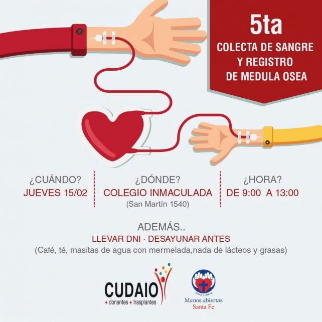 El Centro Único de Donación, Ablación e Implante de Órganos (CUDAIO) junto con la Fundación Manos Abiertas Santa Fe, a través de la campaña “Cuenta Conmigo”, organizan la 5º Colecta de Sangre y Registro de Médula Ósea. Será este jueves 15 de febrero entre las 9 y las 13, en el Colegio Inmaculada (San Martín 1540).