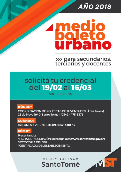 A principios de mes, el Municipio santotomesino firmó un convenio con la empresa Continental para la implementación del medio boleto urbano para docentes y alumnos. Ahora, el Ejecutivo de esa ciudad informó que hasta el próximo 16 de marzo estará vigente el plazo para tramitarlo.