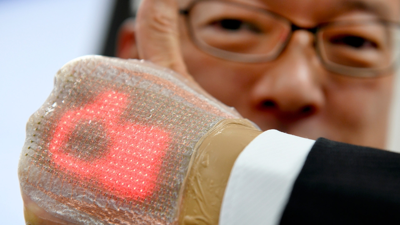 Investigadores japoneses inventaron una pantalla LED ultrafina y elástica que puede adherirse a la piel y mostrar gráficos simples en movimiento, y esperan tener listo un prototipo para comercializarlo en los próximos tres años.