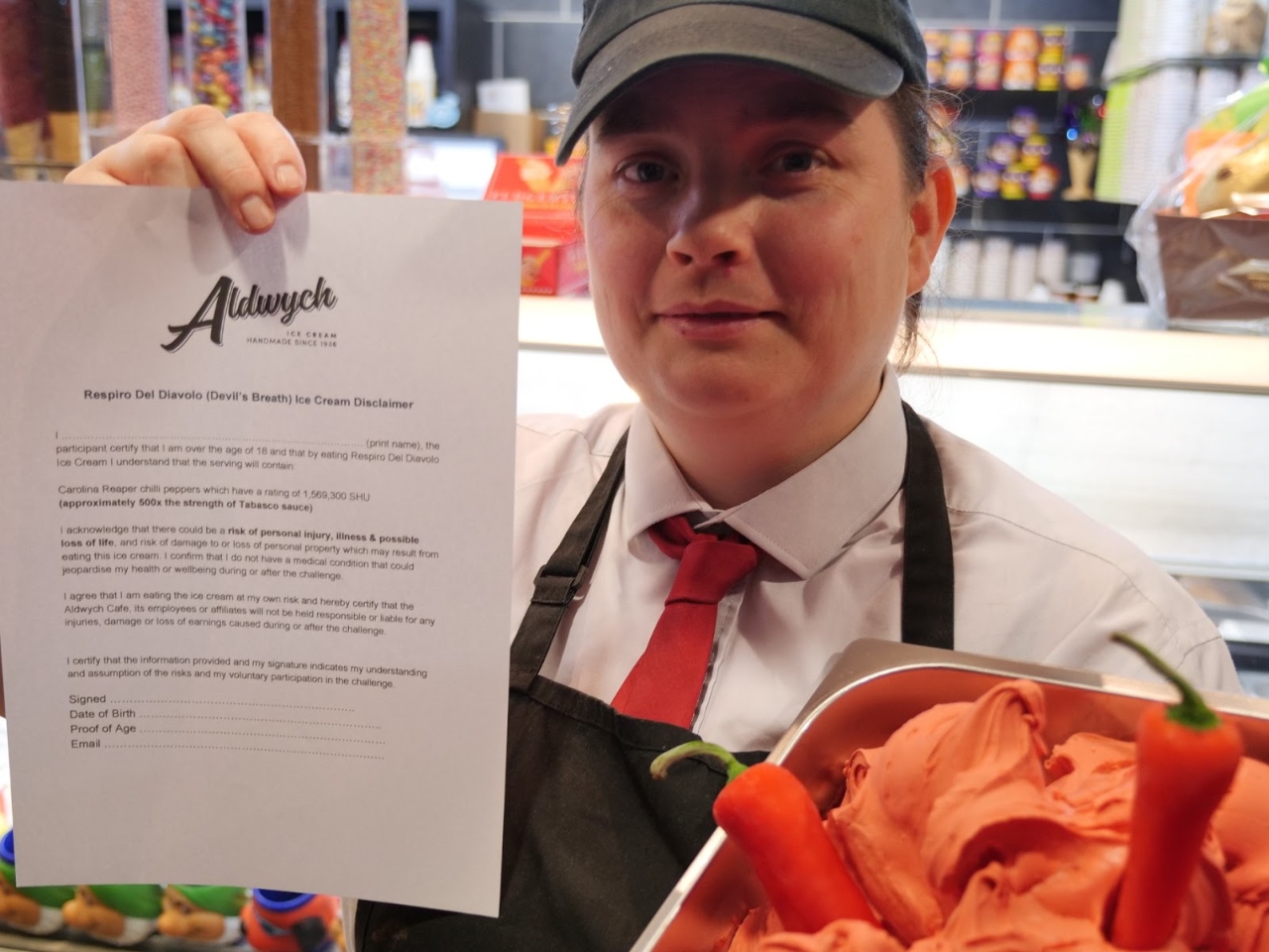 Los que se animan a probar el "Respiro del Diavolo" (respiro del diablo) tienen que firmar un consentimiento. Como cuando te vas a tirar en paracaídas o hacerte algunos estudios de riesgo. "Se acredita que tomar este helado podría producir heridas, enfermedad y hasta la pérdida de la vida", dice el papel que entregan los empleados del Aldwych Café and Ice Cream Parlor, en Glasgow, Escocia.