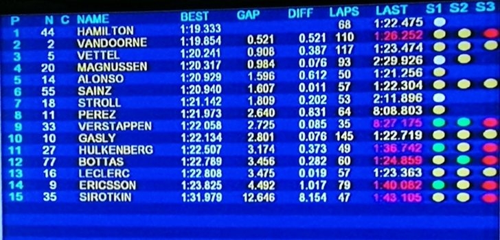 El piloto belga de McLaren mantendría la primera posición durante gran parte de la tarde, siendo además el primero en bajar del 1:20 (1:19.854). Fue una jornada muy productiva para él, pues además logró completar un total de 110 giros. Sin embargo, la salida de Hamilton pondría fin a su liderazgo. Con neumáticos medios, el británico no tardó en escalar hasta la segunda plaza gracias a un registro de 1:19.984. Apenas una hora después, le arrebataría el primer puesto a Vandoorne con un tiempo de 1:19.333, todo ello a pesar de contar con un compuesto cuatro veces más duro que el del piloto de McLaren. Un dato a tener muy en cuenta. Poco antes asistiríamos a una nueva bandera roja, en este caso provocada por Max Verstappen, concluyendo así un día aciago para el equipo Red Bull.