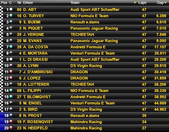 Victoria de Abt, detras Turvey, mientras que Buemi completó el podio mexicano ante una gran cantidad de publico en el circuito Hermanos Rodriguez.