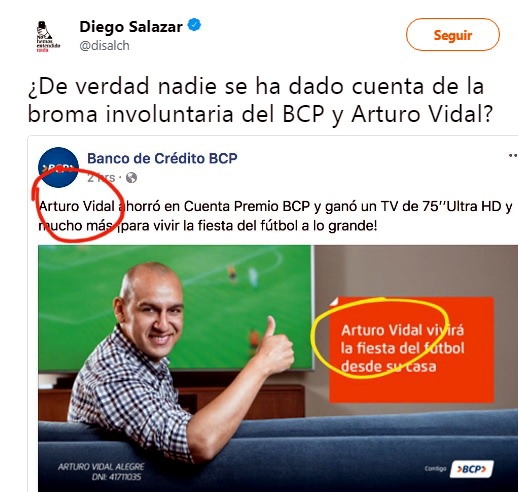 Este martes, el Banco de Crédito del Perú lanzó una campaña utilizando el nombre de uno de sus supuestos clientes, identificado como Arturo Vidal Alegre, y facilitando hasta el número de su documento de identidad, para promocionar una oferta con el siguiente mensaje: