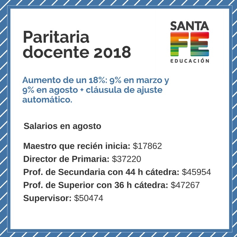 Los referentes de Amsafé, Sadop, UDA y AMET recibieron igual oferta que los de gremios estatales: 18% en dos tramos iguales (marzo y agosto), y cláusula gatillo "libre". Un maestro que recién se inicia en la profesión ganará 17.862 pesos