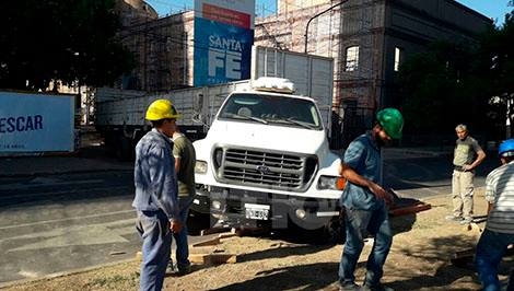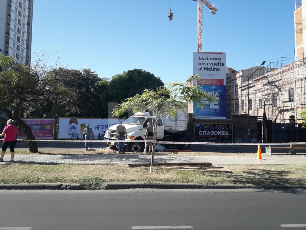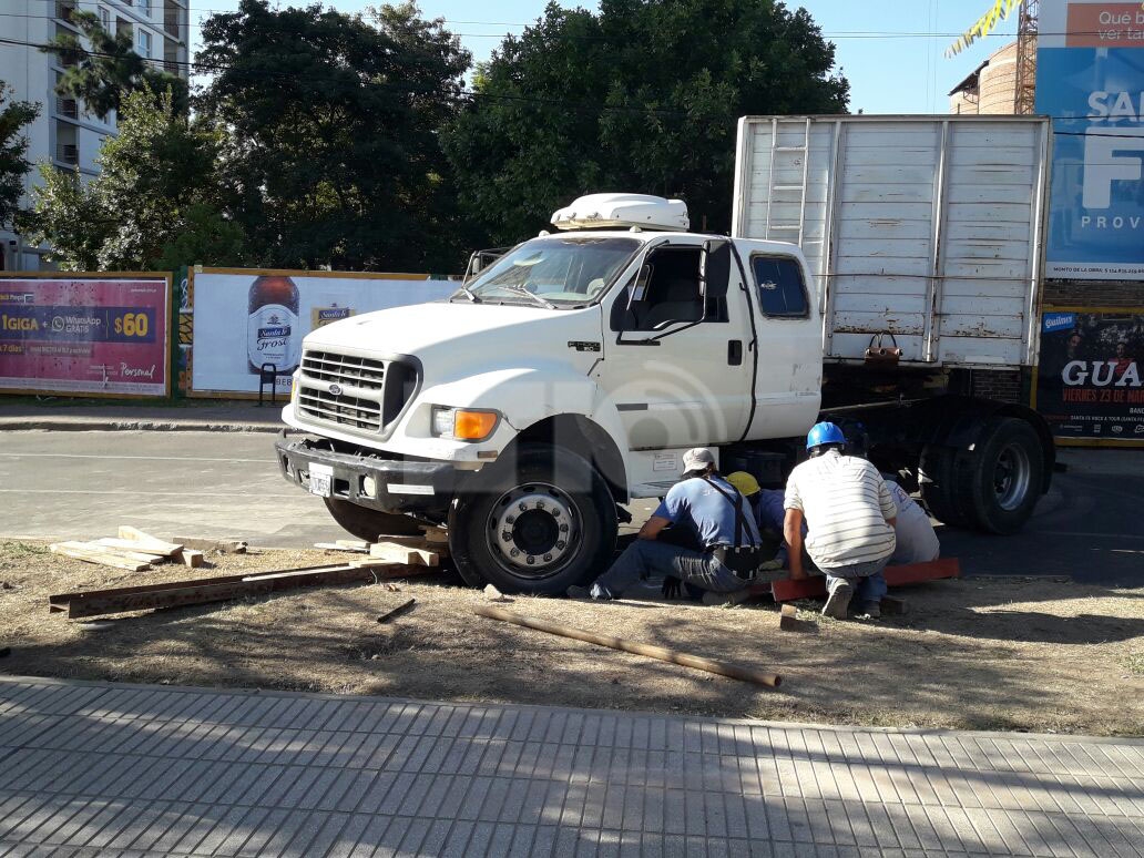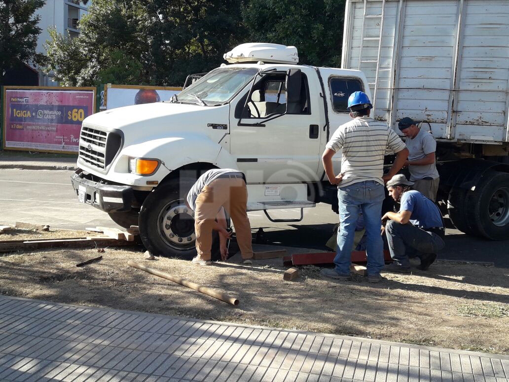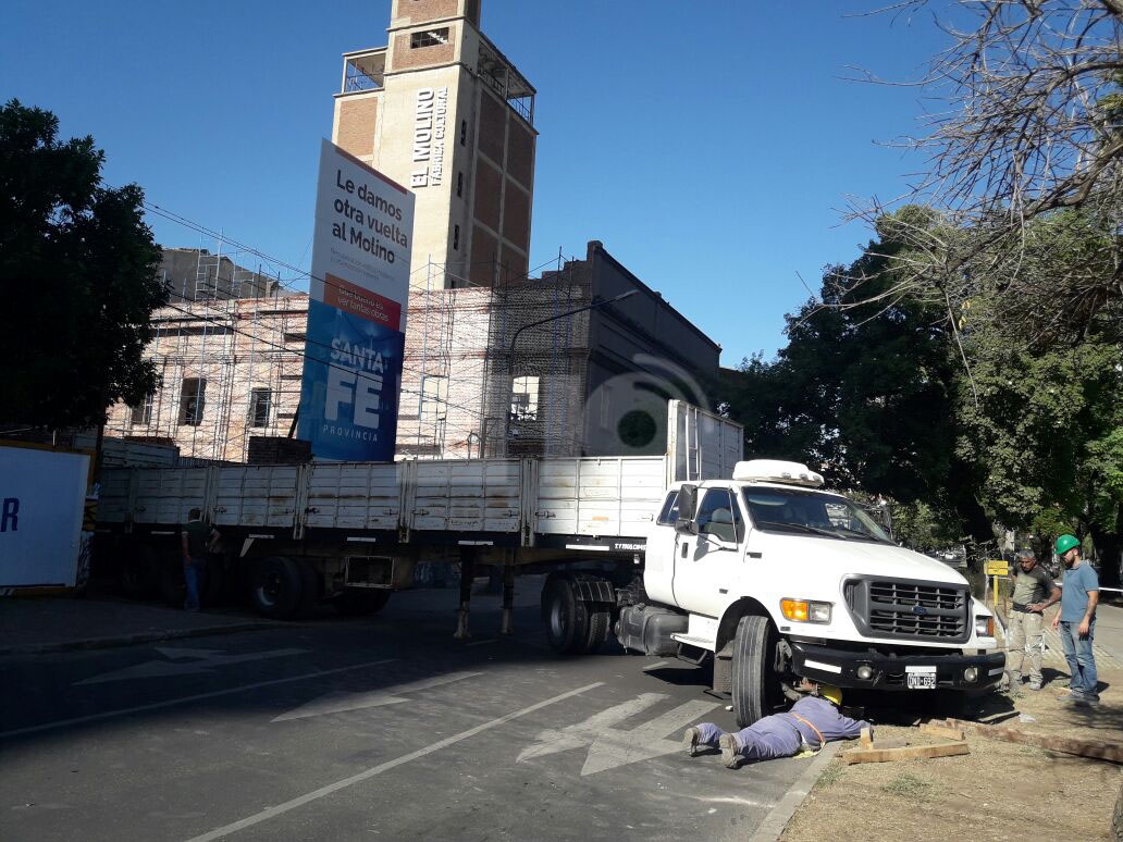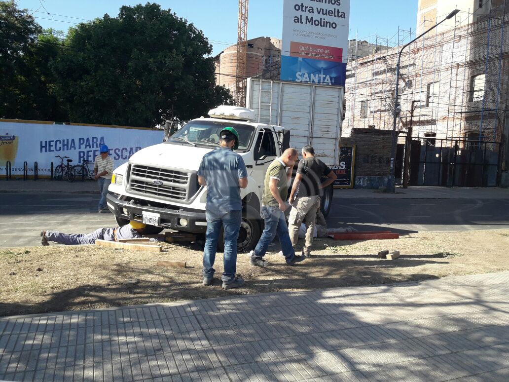 Salía de una obra en construcción que se realiza en el Molino Fábrica Cultural cuando el camionero, a raíz de una mala maniobra, intentó girar el vehículo y terminó sobre el cantero.