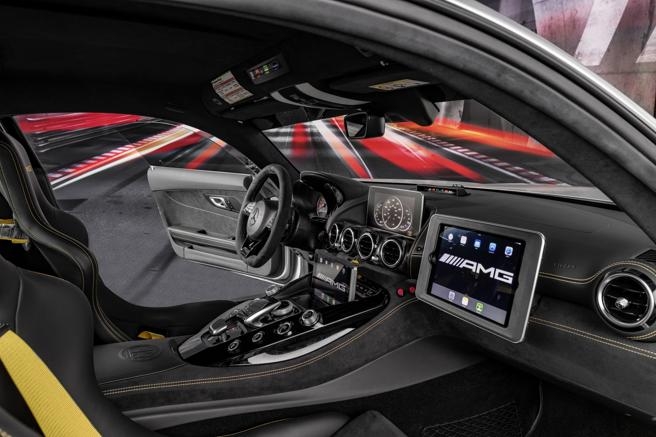 El interior del AMG GT R incluye dos tablets, dispositivos utilizados para monitorear lo que está sucediendo en cada circuito. Una muestra la carrera en vivo, y la restante, otras características como posiciones de los autos y tiempos por vuelta.