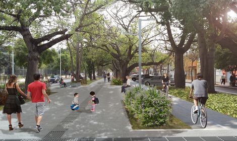 Sobre el cantero central, y a partir de la optimización del espacio de estacionamiento, el proyecto incorpora una bicisenda en sentido norte-sur a lo largo de todo el corredor, como modo de promoción de este medio de movilidad sustentable.