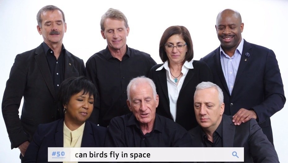 La revista estadounidense Wired puso frente a una cámara a Jeffrey Hoffman, Chris Hadfield, Jerry Linenger, Leland Melvin, Mae C. Jemison, Mike Massimino y Nicole Stott, siete astronautas que estuvieron en la Estación Espacial Internacional. La idea del video fue que respondieran las 50 preguntas sobre el espacio más consultadas en Google. ¿La sorpresa? Algunas resultaron incoherentes, otras demasiado "livianas" y, las menos, muy "detallistas".