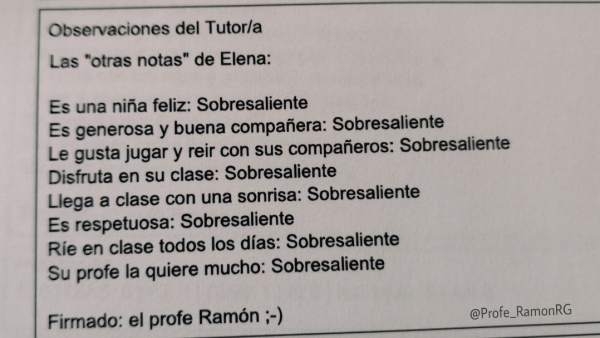 Se trata de el 'Profe Ramón', quien no solo les entregó las calificaciones habituales, sino que quiso destacar lo mejor de sus alumnos con otras notas más especiales, las "otras notas" como el propio profesor las llama, en las que califica las cualidades personales de sus alumnos, como es el caso de Elena.