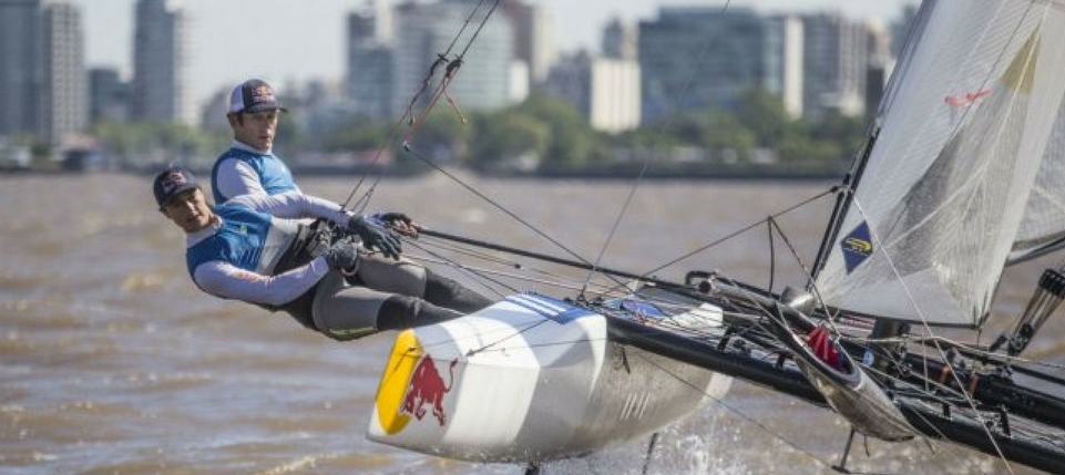 Los argentinos finalizaron terceros, cuartos y 18º en las regatas de la tercera jornada y, luego de nueve pruebas, subieron al tercer puesto, entre 47 duplas, con 34 unidades, en tanto los líderes son los italianos Ruggero Tita y Caterina Banti con catorce y los británicos Ben Saxton y Nicola Boniface están segundos con 28.