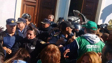 El episodio en cuestión se registró este jueves al mediodía, cuando integrantes del sindicato quisieron ingresar por la puerta de la Casa de Gobierno ubicada en Vacchina y Belgrano, en Rawson.