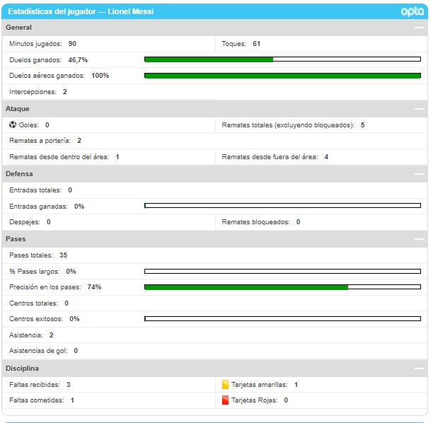 Tan irreconocible estuvo Leo que, además de rematar -sin éxito- al arco sólo en dos oportunidades, ganó menos de la mitad de los duelos de pelota que disputó (apenas el 46,7%) y hasta vio la tarjeta amarilla por un foul táctico.