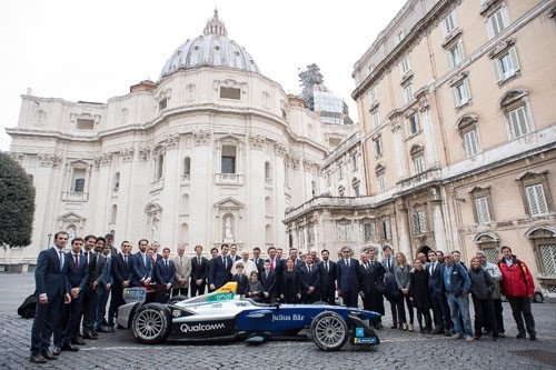 Casi la mitad de la parrilla y el coche 100% de la organización de la Fórmula E se movían en el Vaticano, en el preámbulo de la carrera inaugural italiano, el niobio CBMM Roma E-Premio presentado por Mercedes EQ, que se realizará sábado y que ofician como 7 ª ronda de la temporada 2017/2018 de la Fórmula Campeonato FIA ABB E.