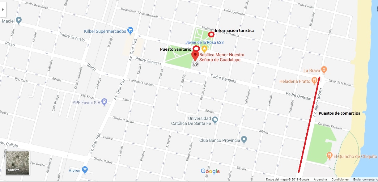 Asimismo, hay dos puestos sanitarios. Uno se ubica en Javier de la Rosa y Antonia Godoy; y el otro en Italia y Javier de la Rosa. También se instalaron tres puntos donde se suministra agua: en Alte. Brown y Obispo Príncipe, sector donde se dispondrán los puestos gastronómicos; en Antonia Godoy entre Regimiento 12 de Infantería y Javier de la Rosa; y en Italia y Javier de la Rosa.