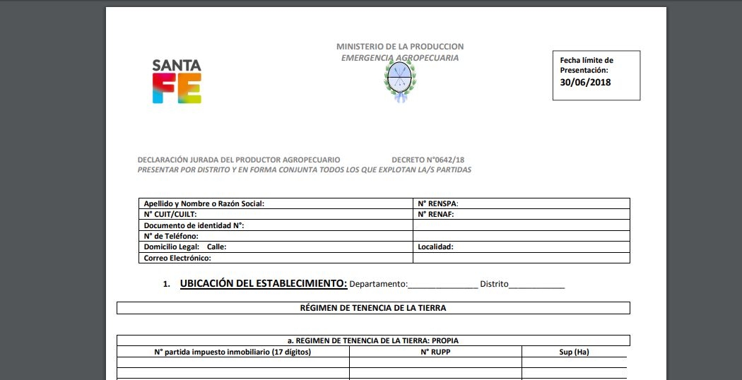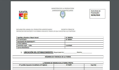 El gobierno de la provincia de Santa Fe informó a los productores que quieran obtener los beneficios del Decreto 0642/2018 que deberán completar un formulario de declaración jurada disponible on line en el destacado “Emergencia Agropecuaria” del portal oficial y anexar toda la documentación respaldatoria.
