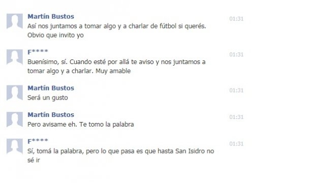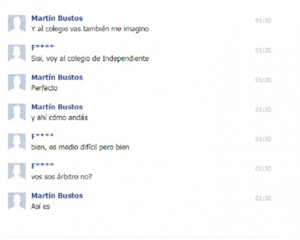 "Hola crack. Gracias por aceptar", arranca. "¿Cómo va? No es nada", contesta el chico. Recién entablada la conversación, Bustos le confirma que es árbitro de fútbol. Un dato que se toma como agravante en la causa que investiga la fiscal María Soledad Garibaldi, ya que el adulto podría haber aprovechado su autoridad en la cancha para atrapar a los chicos.