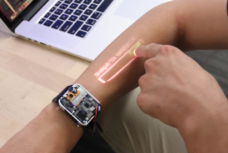 Se trata del LumiWatch que integra un picoproyector láser y una serie de sensores para generar una imagen de 1024×600 pixeles sobre la piel del brazo que es posible manipular como si se tratara de la pantalla de un teléfono móvil. Como pueden apreciar en el video, es posible deslizar el dedo y tocar para un sencillo control del dispositivo.