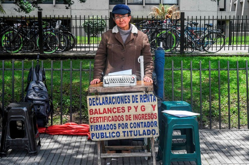 De 63 años, Candelaria insiste en ser llamada por su apellido de casada y es la única mujer que ejerce este oficio a las afueras de un moderno centro de trámites en la capital colombiana.